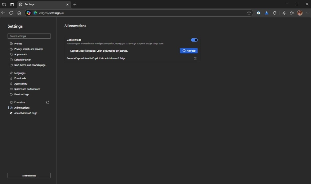 Users can easily toggle Copilot Mode on or off at any time via Edge settings, and browsing reverts to the classic experience if Copilot is disabled.