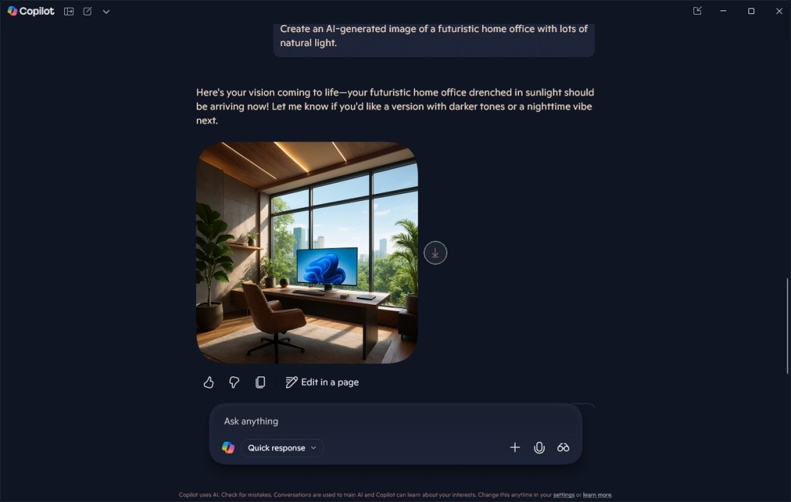 Copilot in Windows 11 now integrates generative AI for images (powered by DALL-E, Microsoft Designer, or Bing Image Creator, depending on your settings/region).