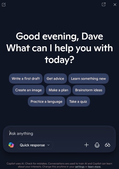Step 2: A side panel opens on the right side of your screen—the Copilot interface.