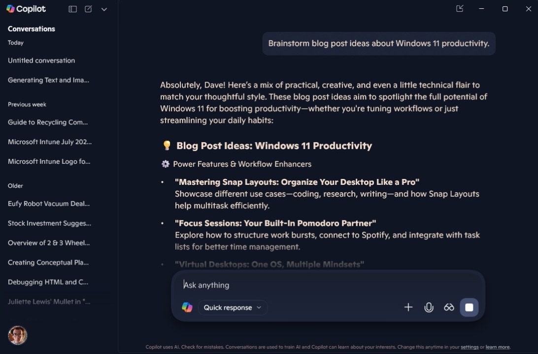 Copilot’s text capabilities are wide-ranging: from composing emails or blog posts to brainstorming ideas, summarizing documents, drafting code, or rewriting text. Here’s how you can generate custom text content: